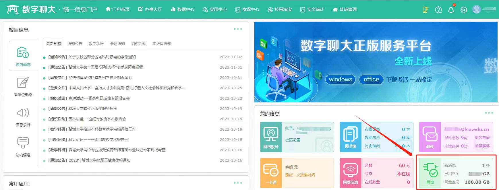 近日,为进一步提升我校信息化服务能力,网络信息中心建设了聊大网盘系统,已完成调试部署,现正式启用。启用后,能方便全校教职工共享文件资源,解决广大教职工依赖U盘、移动硬盘,遇到的故障率高、安全性低、便利性不足等问题,助力教学科研和管理工作。