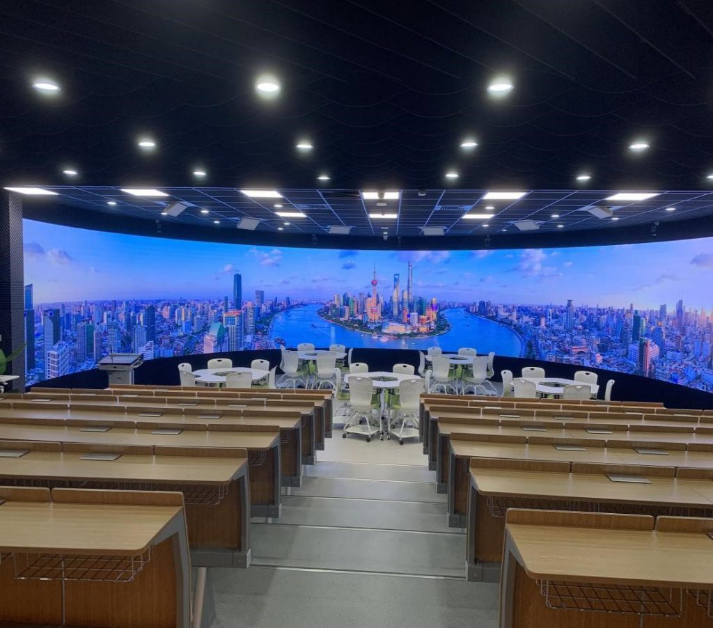 全景教学空间面向全校教工开放,经审批后使用。主要用于示范教学、专家讲座、思政课堂、直播教学、虚拟VR教学等。