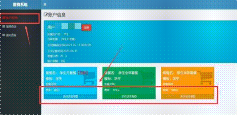 ,在左侧弹出的菜单栏中点击“账户信息”后,选择所要使用的套餐即可缴费。如下图所示: