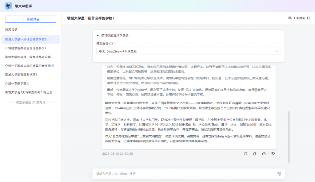 目前已试点搭建学校专属业务问答助手(正在全面调优)和聊大AI助手(DeepSeek-R1 671B满血版等大模型)综合问答平台,师生可通过数字聊大门户首页或移动端企业微信工作台体验。