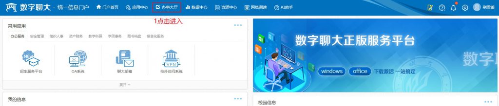 方式一:打开浏览器,进入数字聊大,在页面顶部导航栏,点击“办事大厅”,具体步骤参照以下操作即可。
